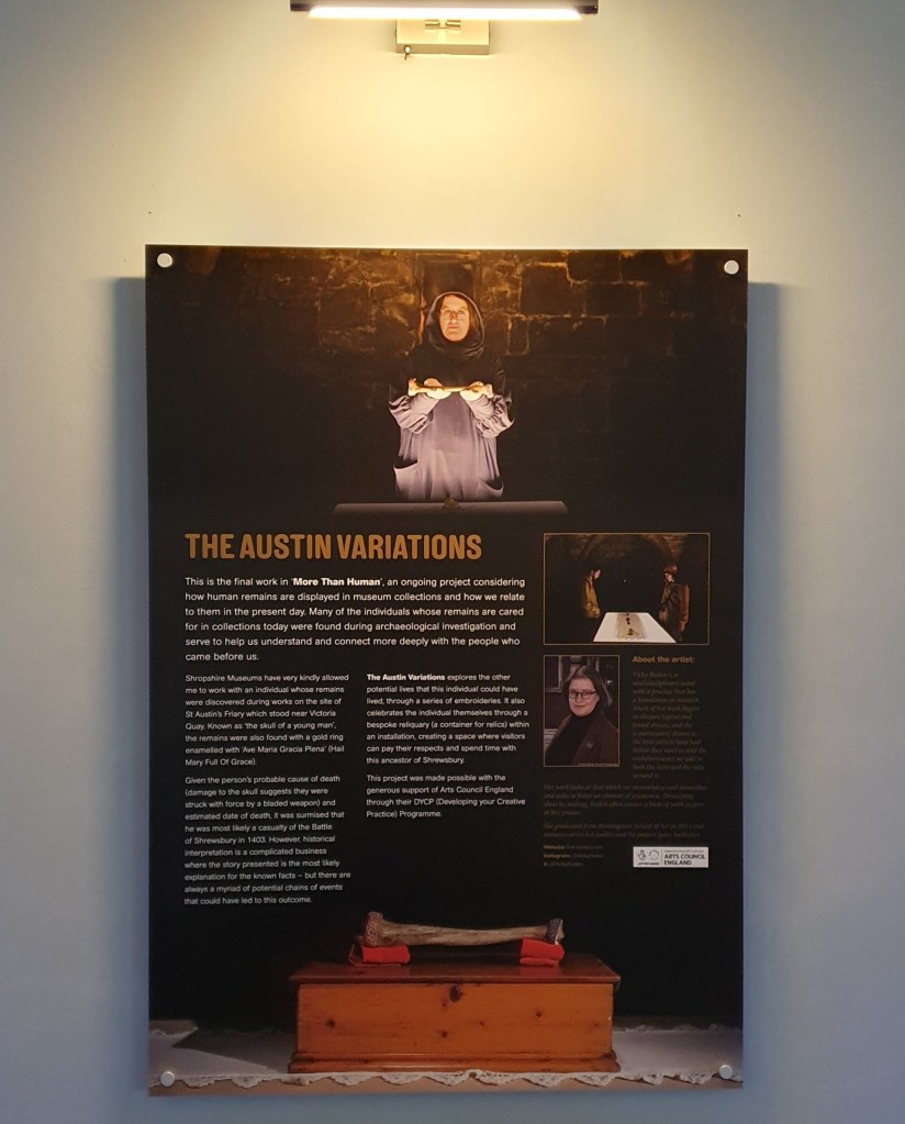The Austin Variations explores both the other potential lives that this individual could have lived through a series of embroideries and celebrates the individual themselves through a bespoke reliquary within an installation, creating a space where visitors can pay their respects and spend time with this ancestor of Shrewsbury.